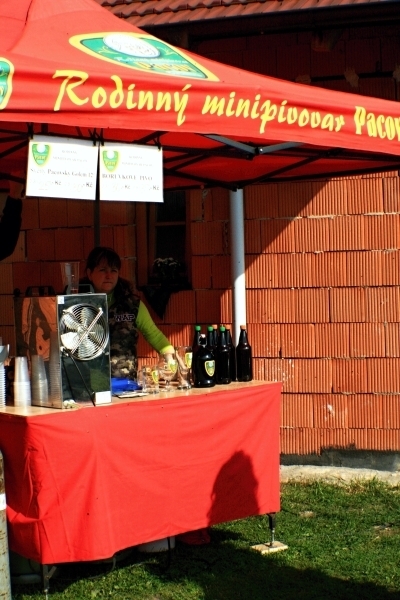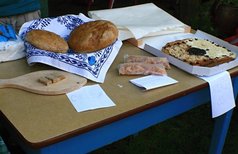 Kdo přišel včas, mohl si pochutnat na domácím krůtím vývaru, pečeném kůzlečím mase s křenem, hořčicí a chlebem a dýňovém nákypu. Také se zde prodávali domácí koláče velké jak talíře,domácí dýňový džus, kteří všichni přítomní moc chválili (my jsme ho ovšem neměli možnost ochutnat – došel ještě před tím, než jsme přijeli). Moc nám ovšem zachutnalo borůvkové pivo z minipivovaru Pacov. Jeho příjemně osvěžující chuť nám při parném odpoledni dodala potřebnou energii. Také jsme ochutnali pohankový dort s bezinkovou marmeládou a nejen my, ale všichni kdo jej ochutnali se olizovali až za ušima.